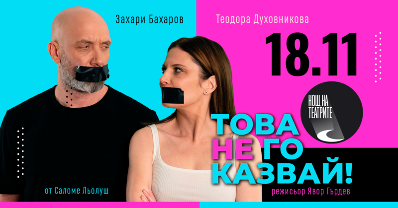Те са Теодора Духовникова и Захари Бахаров и под режисурата на Явор Гърдев заедно „сглобяват“ на театралната сцена „Това не го казвай!“. Френската пиеса от Саломе Льолуш е с три номинации за наградата „Молиер“ 2022 (Най-добра комедия; Най-добър актьор в частен театър; Най-добър автор).