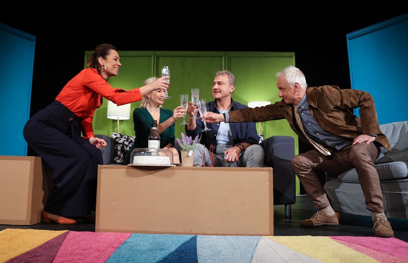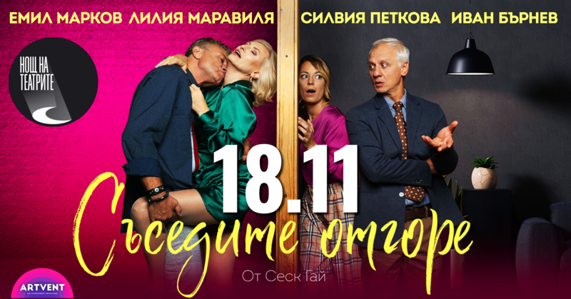 Анотация: Лилия Маравиля, Силвия Петкова, Емил Марков и Иван Бърнев влизат в бурни отношения „по съседски“ в новата комедия „Съседите отгоре“. Адаптацията на хитовия испански филм от Сеск Гай ще дебютира на българската театрална сцена през режисьорския поглед на Емил Марков. Продуцент на спектакъла е Artvent.