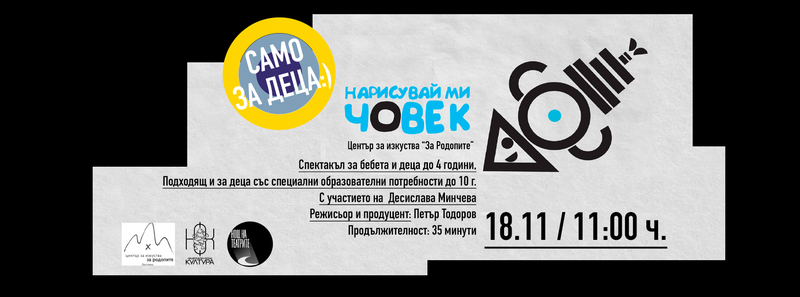 НАРИСУВАЙ МИ ЧОВЕК е предназначен за една много специфична възрастова група /1-4 г/ и е съобразен с препоръките и указанията на професионален детски психиатър. Спектакълът цели да стимулира чувствителността и емоционалността на най-малките, като едновременно с това полага основите на естетическото им възпитание. Възприятията на едно дете и формирането на вкус и отношение към изкуството в неговата по-късна възраст се базират на това, до което то се докосва в първите години от своя живот. Ето защо НАРИСУВАЙ МИ ЧОВЕК е една добра възможност за родителите да срещнат своите деца с театъра по най-адекватен и смислен начин, изцяло отговарящ на нуждите им.